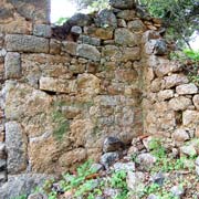 De quelle époque date ces ruines ? Il est difficile de se prononcer car il est plus que probable que les Grecs ont dû y apporter des modifications (par exemple l’angle sud-est englobé dans le mur de l’église actuelle) mais il est certain qu’un édifice existait à cet emplacement dès le moyen-âge. On peut encore voir d’ailleurs des blocs de cet édifice insérés dans le bas du campanile et dans les portiques d’entrée.