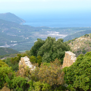 Datant de la fin du 10e siècle pour certains, du 12e siècle pour d’autres, ses blocs rouges contrastent avec le vert des oliviers sauvages et des arbousiers.