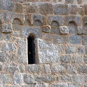 Une petite fenêtre meurtrière se profile sous l’arcature. Elle est surmontée d’une petite archivolte avec des lignes gravées imitant le jeu de claveaux. Ces éléments classent l’édifice comme préroman et plaident pour une datation du 9e siècle.